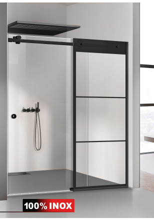 Usa sticla dus culisanta cu perete fix Glissando Black model Vintage negru, sticla clara, securizata, cu canturi slefuite si perfect lucioase. Cabina de dus cu usa glisanta la dimensiuni standard se fabrica pentru urmatoarele latimi de nisa: 80-90 / 90-100 / 100-110 / 110-120 / 120-140 / 140-150 / 150-160 / 160-170 / 170-180 cm x 205 cm. Executie pretentioasa cu materiale de calitate top si de durata. Peretele de dus cu usa glisanta are toata feroneria din material negru mat cu un aspect si o calitate deosebita in stil industrial! Decorat prin sablare tratata cu cea mai moderna tehnologie nano fabricat in Germania.