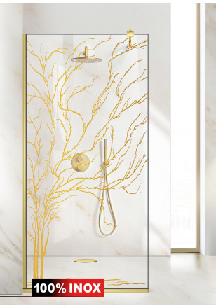 Paravan Cabina dus Walk-In, Aqua Roy ® Gold model TREE auriu, sticla clara, securizata,de 8 mm grosime, geam dus la dimensiuni standard: 50/60/70/80/90/100/110/120/130/140 cm x 195 cm, cu intrare laterala, executie pretentioasa cu materiale de calitate top si de durata. Peretele de dus are toata feroneria de culoare aurie luciu oglinda cu un aspect si o calitate deosebita!