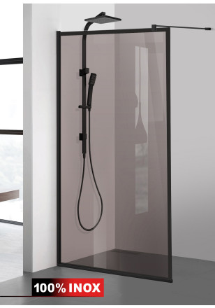 Paravan de dus WALK-IN cu intrare laterala, decorata. Produs personalizat (model, culoare model la alegere) se executa la comanda – livrare in max.7 zile lucratoare! Model decorare prezentat: AQUA ROY BLACK FRAME, din sticla BRONZ SECURIZATA de 8 mm grosime, cu tratament anticalcar- executie pretentioasa cu materiale de calitate top si de durata precum si un design minimalist si modern. Culoarea decorului este obtinuta cu cea mai avansata tehnologie nano – fabricat exclusiv in Germania.