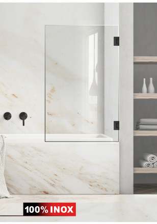 Paravan cada din sticla clara model: RAVANA BLACK fara rama sau profil! Peretele de cada cu balama are avantajul ca nu se prinde de marginea cazii, si nici de perete cu profil si ca urmare poate fi curatata si intretinuta igiena cazii si sub/langa paravan.