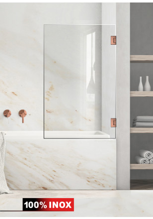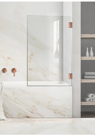Paravan cada din sticla clara model: RAVANA COPPER fara rama sau profil! Peretele de cada cu balama are avantajul ca nu se prinde de marginea cazii, si nici de perete cu profil si ca urmare poate fi curatata si intretinuta igiena cazii si sub/langa paravan.