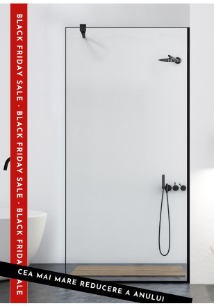 Paravan Cabina dus Walk-In, Aqua Class ® Black sticla clara, securizata, geam dus la dimensiuni standard: 50/60/70/80/90/100/110/120 cm x 195 cm, cu intrare laterala, executie pretentioasa cu materiale de calitate top si de durata. Peretele de dus are toata feroneria negru mat cu un aspect si o calitate deosebita!