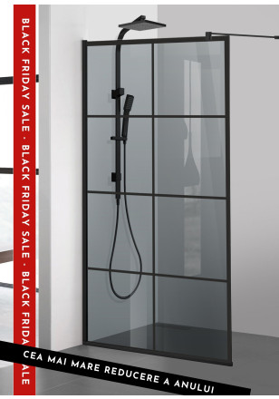 Paravan dus WALK-IN model: AQUA ROY® BLACK MODE sticla gri, securizata, sablata de 8 mm grosime, deosebit de rezistenta, de diferite dimensiuni: 70/80/90/100/110/120 x 195 cm. Perete dus sticla cu intrare laterala, executie pretentioasa cu materiale de cea mai buna calitate.