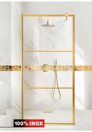 Paravan dus WALK-IN model: AQUA CLASS GOLD VINTAGE sticla clara, securizata, sablata de 6 mm grosime, dimensiuni: 50/ 60/ 70/ 80/ 90/ 100/ 110/ 120 x 195 cm, cu intrare laterala, executie pretentioasa cu materiale de calitate top si de durata. Paravanul de dus Aqua Class Gold Vintage, se bucura de un design rafinat, contemporan si minimalist.