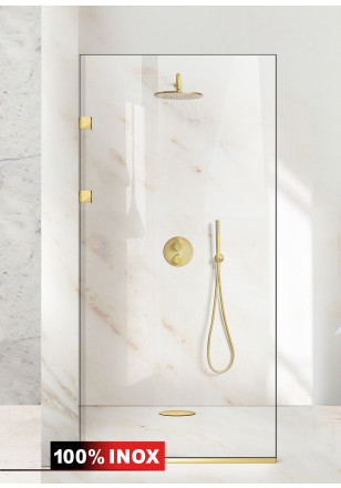 Paravan Cabina dus Walk-In, Aqua Elegance Gold sticla clara, securizata, geam dus la dimensiuni standard: 70/80/90 cm x 190 cm, cu intrare laterala, executie pretentioasa cu materiale de calitate top si de durata. Peretele de dus ieftin si cu toata feroneria culoare aurie luciu oglinda cu un aspect si o calitate deosebita! Usor de montat.