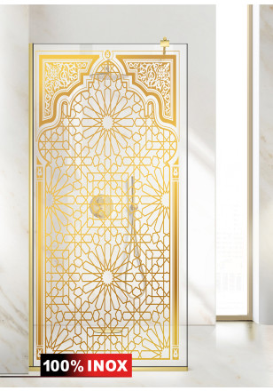 Paravan Cabina dus Walk-In, Aqua Roy ®Gold model Amira auriu, sticla clara, securizata, de 8 mm grosime, geam dus la dimensiuni standard: 50/60/70/80/90/100/110/120/130/140 cm x 195 cm, cu intrare laterala, executie pretentioasa cu materiale de calitate top si de durata. Peretele de dus are toata feroneria de culoare aurie luciu oglinda cu un aspect si o calitate deosebita!