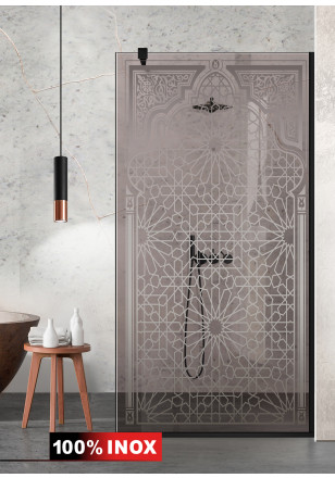 Paravan Cabina dus Walk-In, Aqua Roy ® Black model Amira negru, sticla bronz, securizata, de 8 mm grosime, geam dus la dimensiuni standard: 70/80/90/100/110/120 cm x 195 cm, cu intrare laterala, executie pretentioasa cu materiale de calitate top si de durata. Peretele de dus are toata feroneria negru mat cu un aspect si o calitate deosebita!
