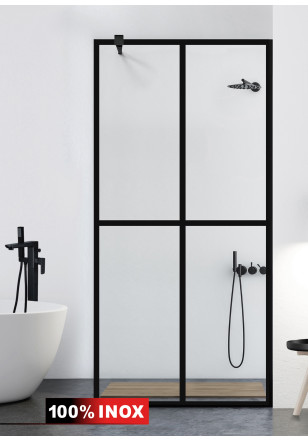 Paravan Cabina dus Walk-In, Aqua Class ® Black model Basic negru, sticla clara, securizata, geam dus la dimensiuni standard: 70/80/90/100/110/120 cm x 195 cm, cu intrare laterala, executie pretentioasa cu materiale de calitate top si de durata. Peretele de dus are toata feroneria negru mat cu un aspect si o calitate deosebita! Inaltimea totala asamblata a produsului este intre 194-195 cm in inaltime (in functie de diferentele de nivel la pardoseala).