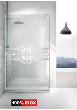 Paravan Cabina dus Walk-In, Aqua Roy ® INOX model Doha Medalion alb/incolor, sticla clara, securizata,de 8 mm grosime, geam dus la dimensiuni standard: 50/60/70/80/90/100/110/120/130/140 cm x 195 cm, cu intrare laterala, executie pretentioasa cu materiale de calitate top si de durata. Peretele de dus are toata feroneria din INOX SS304 luciu oglinda cu un aspect si o calitate deosebita!