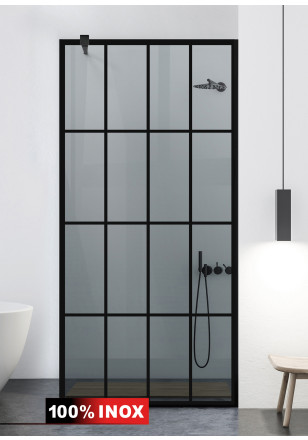 Paravan Cabina dus Walk-In, Aqua Roy ® Black model RANK negru, sticla gri, securizata,de 8 mm grosime, geam dus la dimensiuni standard: 70/80/90/100/110/120 cm x 195 cm, cu intrare laterala, executie pretentioasa cu materiale de calitate top si de durata. Peretele de dus are toata feroneria negru mat cu un aspect si o calitate deosebita!