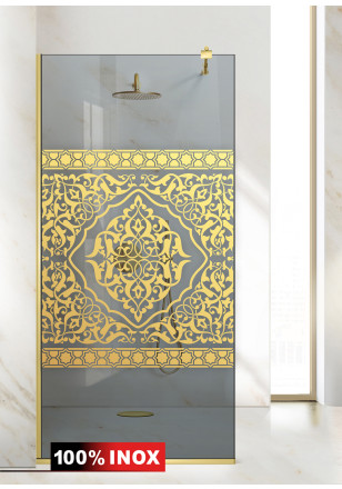 Paravan Cabina dus Walk-In, Aqua Roy ®Gold model Doha Orizontal auriu, sticla gri, securizata, de 8 mm grosime, geam dus la dimensiuni standard: 70/80/90/100/110/120 cm x 195 cm, cu intrare laterala, executie pretentioasa cu materiale de calitate top si de durata. Peretele de dus are toata feroneria de culoare aurie luciu oglinda cu un aspect si o calitate deosebita!