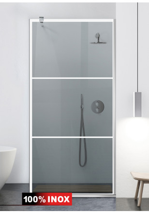 Paravan Cabina dus Walk-In, Aqua Roy ® INOX model Vintage alb,sticla gri, securizata,de 8 mm grosime, geam dus la dimensiuni standard: 70/80/90/100/110/120 cm x 195 cm, cu intrare laterala, executie pretentioasa cu materiale de calitate top si de durata. Peretele de dus are toata feroneria din INOX SS304 luciu oglinda cu un aspect si o calitate deosebita! Usor de montat. Timp de montaj ~ 1 ora.