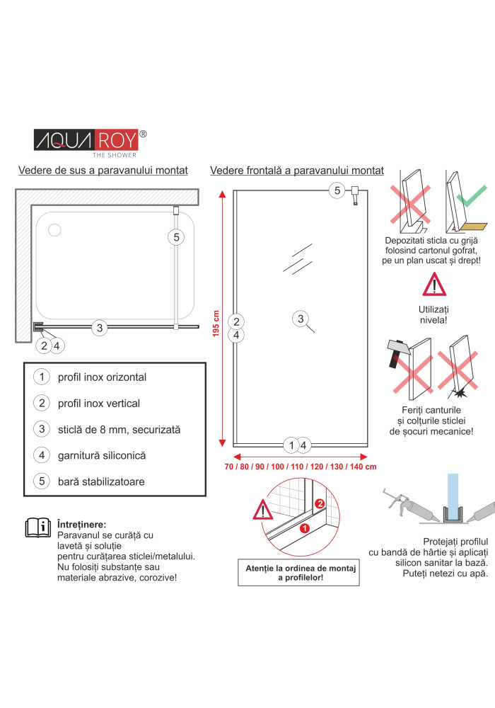 Sticla clara de calitate produsa in UE, securizata, 8 mm grosime, in 6 dimensiuni standard, canturi slefuite perfect lucioase. Aveti posibilitatea sa alegeti din 6 variante de dimensiuni de paravane dus: 70 / 80 / 90 / 100 / 110 /120 mm x 195 cm.