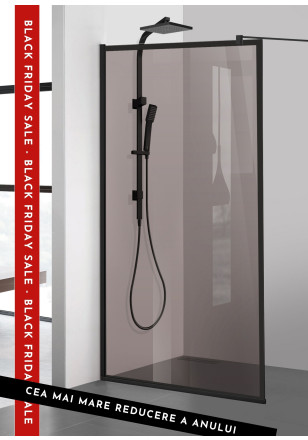 Paravan de dus WALK-IN cu intrare laterala, decorata. Produs personalizat (model, culoare model la alegere) se executa la comanda – livrare in max.7 zile lucratoare! Model decorare prezentat: AQUA ROY BLACK FRAME, din sticla BRONZ SECURIZATA de 8 mm grosime, cu tratament anticalcar- executie pretentioasa cu materiale de calitate top si de durata precum si un design minimalist si modern. Culoarea decorului este obtinuta cu cea mai avansata tehnologie nano – fabricat exclusiv in Germania.