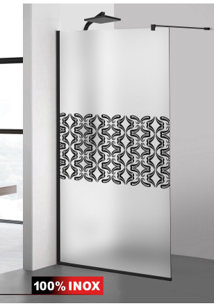 Paravan de dus WALK-IN cu intrare laterala, decorata. Model decorare prezentat: AQUA ROY BLACK GOLDEN TULIP, din sticla MATA SECURIZATA de 8 mm grosime, cu tratament anticalcar- executie pretentioasa cu materiale de calitate top si de durata precum si un design minimalist si modern. Culoarea decorului este obtinuta cu cea mai avansata tehnologie nano – fabricata exclusiv in Germania.