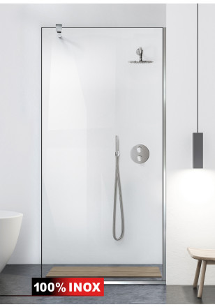 Paravan Cabina dus Walk-In, Aqua Class ® INOX sticla clara, securizata, geam dus la dimensiuni standard: 50/60/70/80/90/100/110/120 cm x 195 cm, cu intrare laterala, executie pretentioasa cu materiale de calitate top si de durata. Peretele de dus are toata feroneria din INOX SS304 luciu oglinda cu un aspect si o calitate deosebita! Usor de montat. Timp de montaj ~ 1 ora. Inaltimea totala asamblata a produsului este intre 194-195 cm in inaltime (in functie de diferentele de nivel la pardoseala).