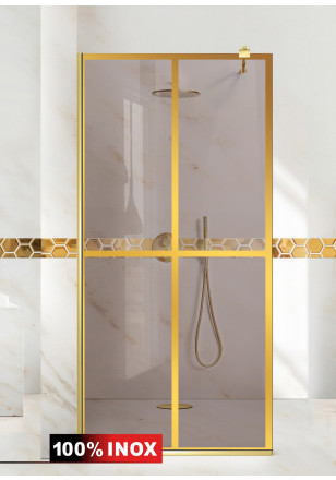 Paravan Cabina dus Walk-In, Aqua Roy ® Gold model BASIC auriu, sticla bronz securizata,de 8 mm grosime, geam dus la dimensiuni standard: 70/80/90/100/110/120 cm x 195 cm, cu intrare laterala, executie pretentioasa cu materiale de calitate top si de durata. Peretele de dus are toata feroneria de culoare aurie luciu oglinda cu un aspect si o calitate deosebita!