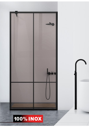 Paravan Cabina dus Walk-In, Aqua Roy ® Black model Club negru, sticla bronz, securizata, de 8 mm grosime, geam dus la dimensiuni standard: 70/80/90/100/110/120 cm x 195 cm, cu intrare laterala, executie pretentioasa cu materiale de calitate top si de durata. Peretele de dus are toata feroneria negru mat cu un aspect si o calitate deosebita!