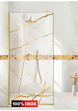 Paravan Cabina dus Walk-In, Aqua Roy ® Gold model MARBLE auriu, sticla clara, securizata,geam dus la dimensiuni standard: 50/60/70/80/90/100/110/120 cm x 195 cm, cu intrare laterala, executie pretentioasa cu materiale de calitate top si de durata. Peretele de dus are toata feroneria deculoare aurieluciu oglinda cu un aspect si o calitate deosebita! Inaltimea totala asamblata a produsului este intre 194-195 cm in inaltime (in functie de diferentele de nivel la pardoseala).