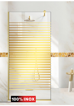 Paravan Cabina dus Walk-In, Aqua Roy ®Gold model Apollo auriu, sticla clara, securizata, de 8 mm grosime, geam dus la dimensiuni standard: 50/60/70/80/90/100/110/120/130/140 cm x 195 cm, cu intrare laterala, executie pretentioasa cu materiale de calitate top si de durata. Peretele de dus are toata feroneria de culoare aurie luciu oglinda cu un aspect si o calitate deosebita!