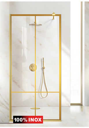 Paravan Cabina dus Walk-In, Aqua Roy ®Gold model Club auriu, sticla clara, securizata, de 8 mm grosime, geam dus la dimensiuni standard: 50/60/70/80/90/100/110/120/130/140 cm x 195 cm, cu intrare laterala, executie pretentioasa cu materiale de calitate top si de durata. Peretele de dus are toata feroneria de culoare aurie luciu oglinda cu un aspect si o calitate deosebita!