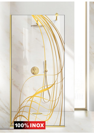 Paravan de dus WALK-IN cu intrare laterala, decorata. Livrare in 7 zile lucratoare! Model decorare prezentat: AQUA ROY GOLD LAVA, din sticla clara SECURIZATA, cu tratament anticalcar 50/60/70/80/90/100/110/120/130/140 x 195 cm, de 8 mm grosime – executie pretentioasa cu materiale de calitate top si de durata precum si un design minimalist si modern. Culoarea decorului este obtinuta cu cea mai avansata tehnologie nano – fabricat exclusiv in Germania.
