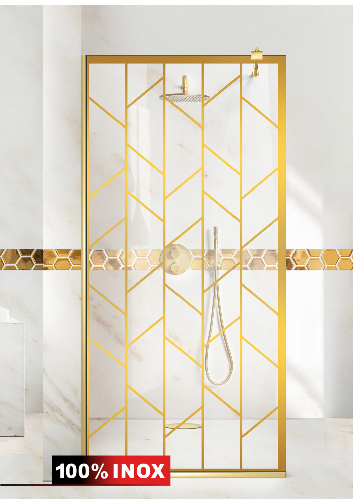 Paravan Cabina dus Walk-In, Aqua Roy ® Gold model ART DECO auriu, sticla clara, securizata, de 8 mm grosime, geam dus la dimensiuni standard: 50/60/70/80/90/100/110/120/130/140 cm x 195 cm, cu intrare laterala, executie pretentioasa cu materiale de calitate top si de durata. Peretele de dus are toata feroneria de culoare aurie luciu oglinda cu un aspect si o calitate deosebita!