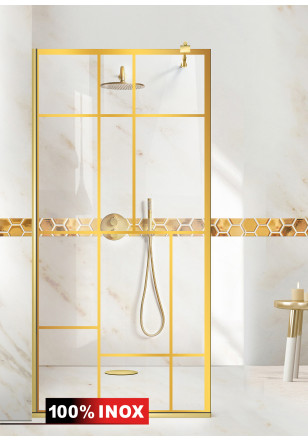 Paravan de dus WALK-IN cu intrare laterala, decorata. Livrare in 3 zile lucratoare! Model decorare prezentat: AQUA ROY GOLD URBAN, din sticla clara SECURIZATA, 50/60/70/80/90/100/110/120/130/140 x 195 cm, de 8 mm grosime – executie pretentioasa cu materiale de calitate top si de durata precum si un design minimalist si modern. Culoarea decorului este obtinuta cu cea mai avansata tehnologie nano – fabricat exclusiv in Germania.