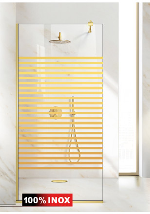Paravan de dus WALK-IN cu intrare laterala, decorata. Livrare in 7 zile lucratoare! Model decorare prezentat: AQUA ROY GOLD BALI, din sticla clara SECURIZATA, cu tratament anticalcar 50/60/70/80/90/100/110/120/130/140 x 195 cm, de 8 mm grosime – executie pretentioasa cu materiale de calitate top si de durata precum si un design minimalist si modern. Culoarea decorului este obtinuta cu cea mai avansata tehnologie nano – fabricat exclusiv in Germania.