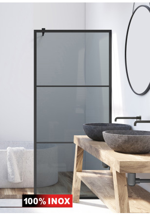 Paravan Cabina dus Walk-In, Aqua Roy ® Black model VINTAGE negru, sticla gri, securizata,de 8 mm grosime, geam dus la dimensiuni standard: 70/80/90/100/110/120 cm x 195 cm, cu intrare laterala, executie pretentioasa cu materiale de calitate top si de durata. Peretele de dus are toata feroneria negru mat cu un aspect si o calitate deosebita!