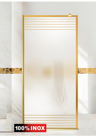 Paravan Cabina dus Walk-In, Aqua Roy ® Gold model FENCE auriu, sticla mata, securizata,de 8 mm grosime, geam dus la dimensiuni standard: 70/80/90/100/110/120 cm x 195 cm, cu intrare laterala, executie pretentioasa cu materiale de calitate top si de durata. Peretele de dus are toata feroneria deculoare aurieluciu oglinda cu un aspect si o calitate deosebita!