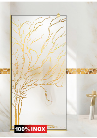 Paravan Cabina dus Walk-In, Aqua Roy ® Gold model TREE auriu, sticla mata, securizata,de 8 mm grosime, geam dus la dimensiuni standard: 70/80/90/100/110/120 cm x 195 cm, cu intrare laterala, executie pretentioasa cu materiale de calitate top si de durata. Peretele de dus are toata feroneria deculoare aurieluciu oglinda cu un aspect si o calitate deosebita!