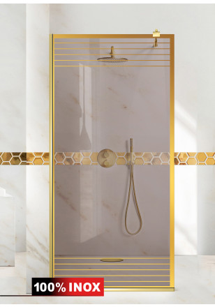 Paravanele de dus au profil INOX luciu oglinda aurie nu numai pe latura verticala ci si la baza sticlei asigurand o stabilitate si o aderenta mai mare la pardoseala! Mai mult: ascunde micile denivelari sau liniile strambe ale peretelui/pardoselii (pana la 1 cm). Alegeti solutii de lunga durata si fara compromisuri!