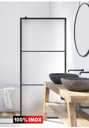 Paravan Cabina dus Walk-In, Aqua Roy ® Black model VINTAGE negru, sticla mata, securizata,de 8 mm grosime, geam dus la dimensiuni standard: 70/80/90/100/110/120 cm x 195 cm, cu intrare laterala, executie pretentioasa cu materiale de calitate top si de durata. Peretele de dus are toata feroneria negru mat cu un aspect si o calitate deosebita!