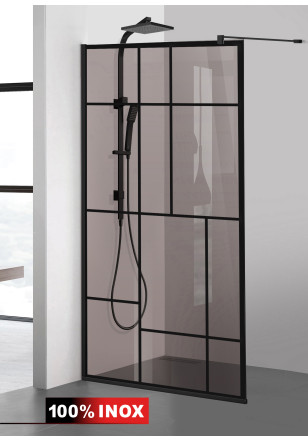 Paravan de dus WALK-IN cu intrare laterala, decorata. Produs personalizat (model, culoare model la alegere) se executa la comanda – livrare in max.7 zile lucratoare! Model decorare prezentat: AQUA ROY BLACK URBAN, din sticla BRONZ SECURIZATA de 8 mm grosime, cu tratament anticalcar- executie pretentioasa cu materiale de calitate top si de durata precum si un design minimalist si modern. Culoarea decorului este obtinuta cu cea mai avansata tehnologie nano – fabricat exclusiv in Germania.