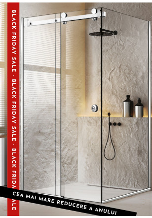 - Pe latura frontala: dintr-o usa dus culisanta din sticla clara securizata (6 mm grosime) in combinate cu un perete de dus fix