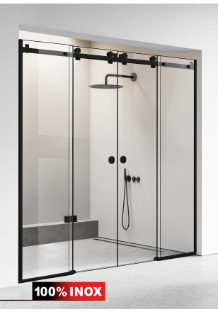 Doi pereti de dus cu doua usi culisante la mijloc model Glissando PREMIUM negru mat, sticla clara, securizata, cu canturi slefuite si perfect lucioase, cabina de dus cu usa glisanta la dimensiuni standard se fabrica pentru toate tipurile de gol cuprinse intre latimea de 175 cm si 295 cm. Inaltimea peretelui de dus este 205 cm. Va rugam alegeti dimensiune de perete potrivita pentru golul dvs.