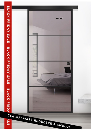 Usa interioara sticla culisanta pentru interioare culiseaza in totalitate pe partea de sus in sina de glisare, acoperita cu un capac decorativ din aluminiu culoare negru mat. Ca urmare pe pardoseala nu veti avea nimic in afara unui buton de ghidaj de 5 cm, care se monteaza la coltul usii. Simplu de montat! In pachet aveti si instructiuni de montaj.